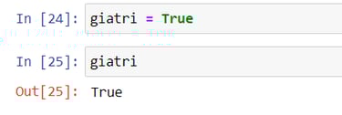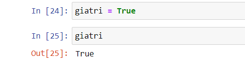 Ngoài việc gán giá trị cho biến là dạng số và text. Thì bạn có thể gán giá trị là dạng True hoặc False. Trong ví dụ trên, mình gán biến tên là giatri có giá trị là True. Sau đó mình chạy code và có kết quả là True.