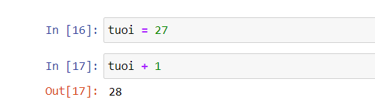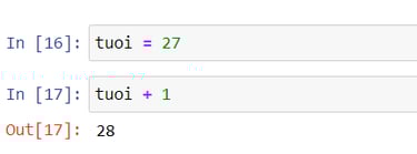 Trong ví dụ trên. Mình có đặt tên biến là tuoi và nó có giá trị số là bằng 27. Năm sau mình sẽ thêm một tuổi và mình sẽ lấy biến tuoi cộng thêm 1 và xem kết quả nó sẽ chạy ra gì. Bạn nhấn tổ hợp phím Ctrl + Enter để chạy chương trình. Cuối cùng đúng như mình dự đoán, kết quả đã ra là bằng 28.