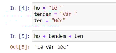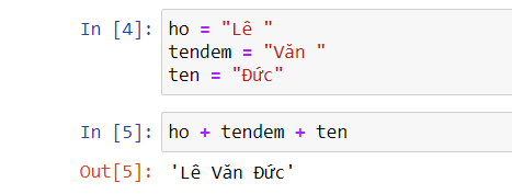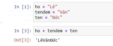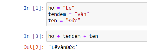 Qua ví dụ về biến có giá trị là dạng text/chữ. Mình lần lượt đặt 3 biến bao gồm : Biến ho, biến tendem, biến ten. Như bài viết về các toán tử cơ bản trong Python, mình có đề cập về nối chữ bằng việc sử dụng dấu + . Bây giờ mình sẽ nối 3 biến này để tạo thành họ và tên đầy đủ của mình. Kết quả chạy lệnh là LêVănĐức