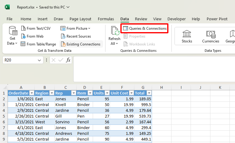 Bước 1: Bạn vào thẻ Data, sau đó chọn Queries & Connections