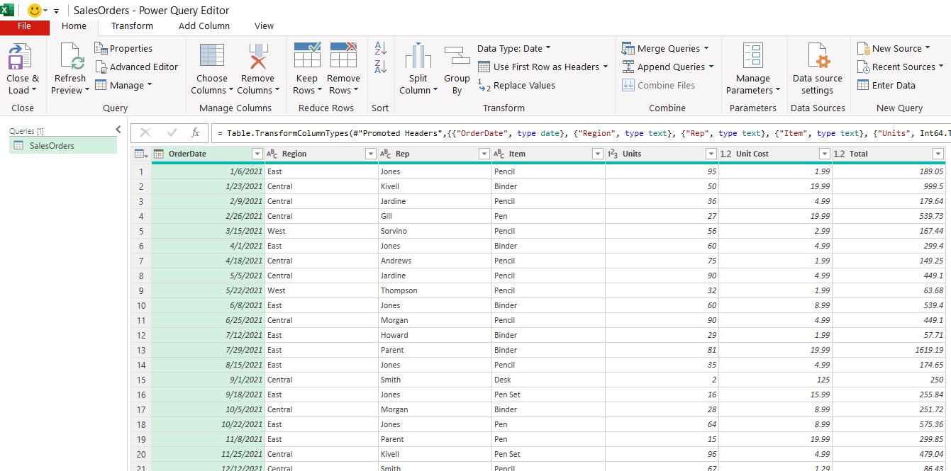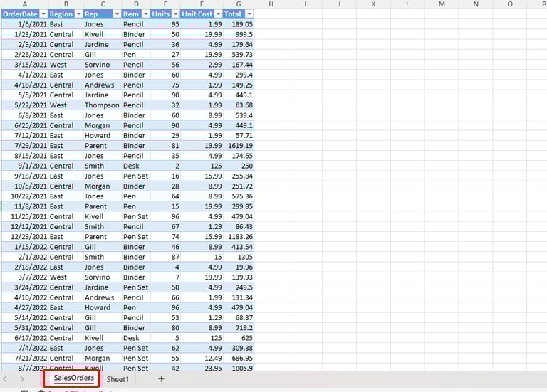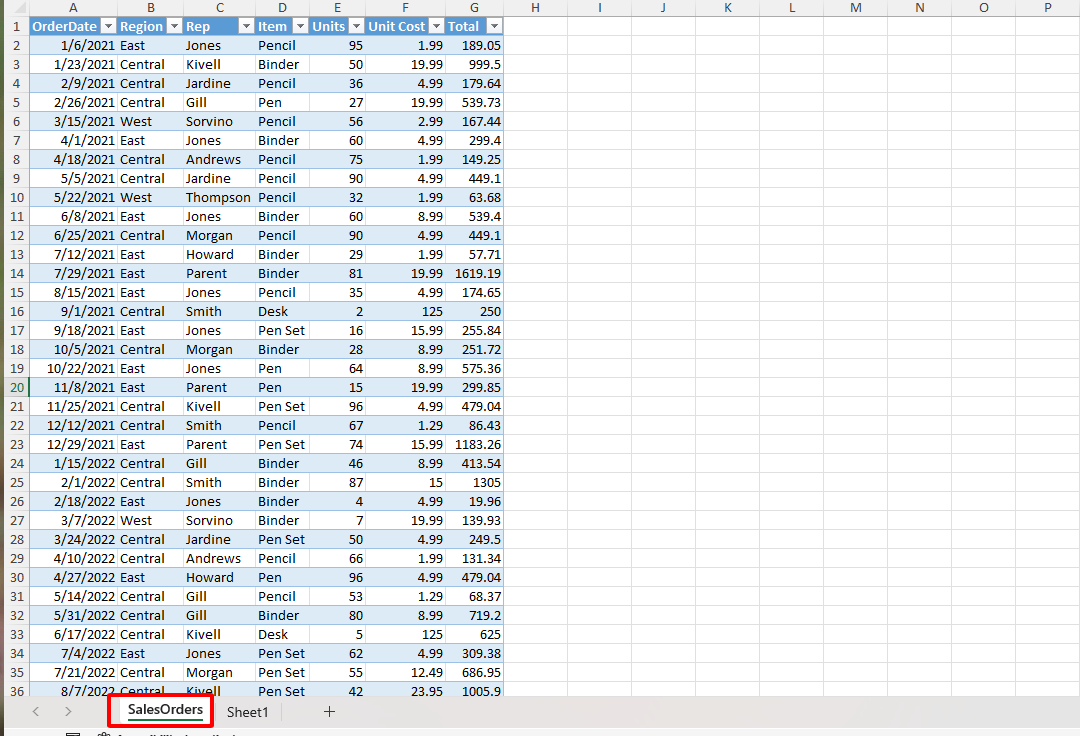 Hình ảnh bên dưới là sheet SalesOrders là kết quả mà bạn đã làm báo cáo. Trong báo cáo này, bạn đã lấy dữ liệu từ một file excel nào đó.