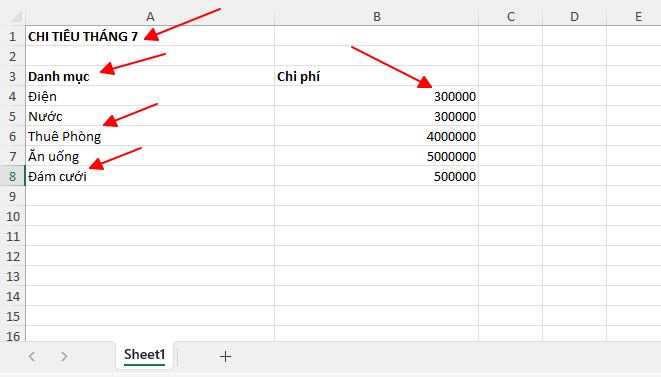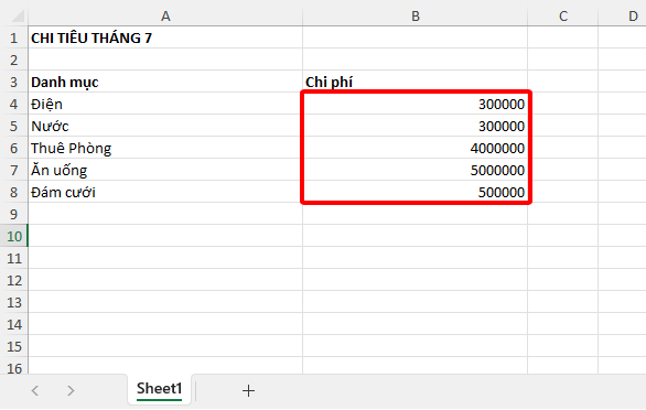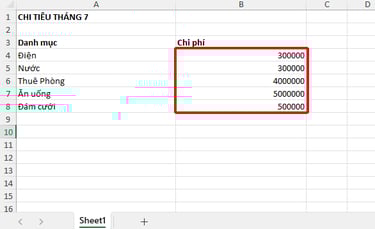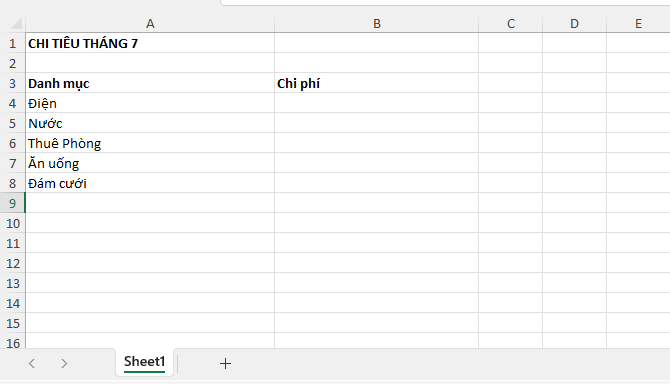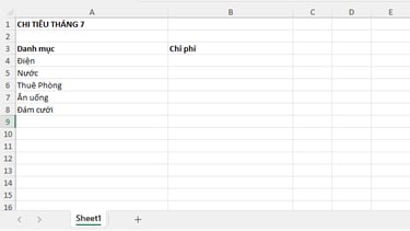 Bảng nhập liệu bên dưới là mình đang ghi nhận các chi phí mà mình đã chi tiêu trong tháng 7. Bao gồm từ tiền điện, nước, thuê phòng, ăn uống và tiền đám cưới.