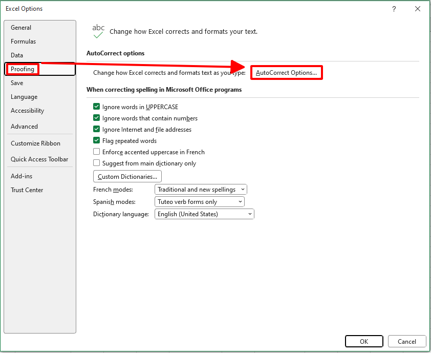 Chọn Proofing (Kiểm tra chính tả) từ danh sách bên trái.