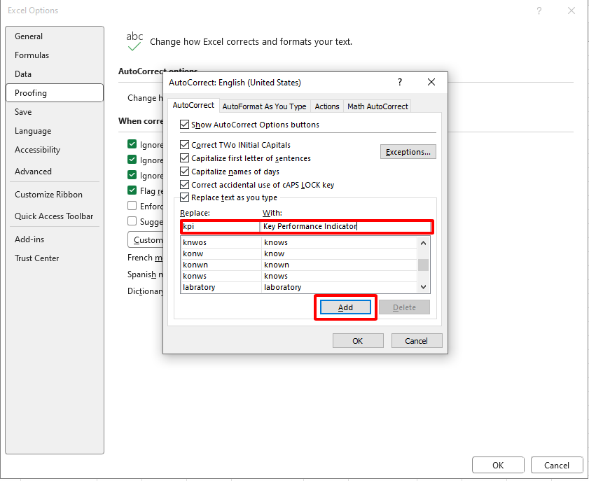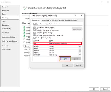 Ví dụ: Gõ “kpi” vào ô Replace và “Key Performance Indicator” vào ô With, Excel sẽ tự động thay thế “kpi” bằng “Key Performance Indicator” mỗi khi bạn nhập.