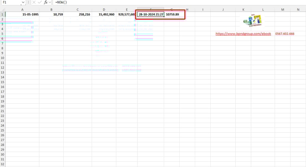 Bước 1: Ở ô F1, nhập =NOW() để Excel tự động cập nhật ngày và giờ hiện tại.