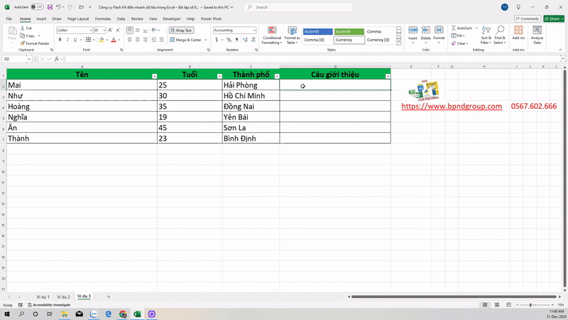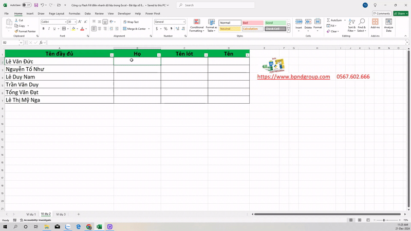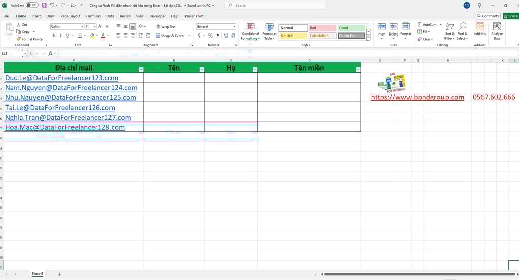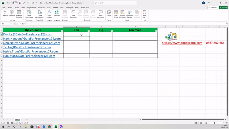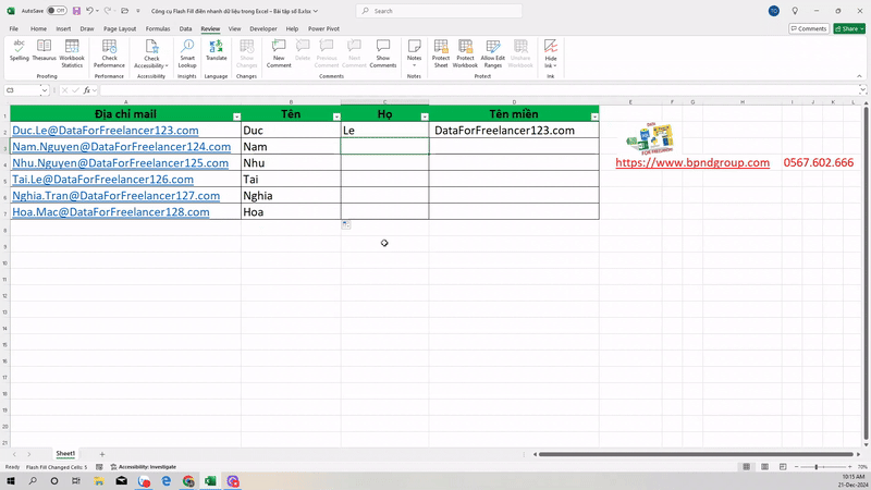 Công cụ Flash Fill điền nhanh dữ liệu trong Excel – Bài tập số 8