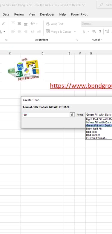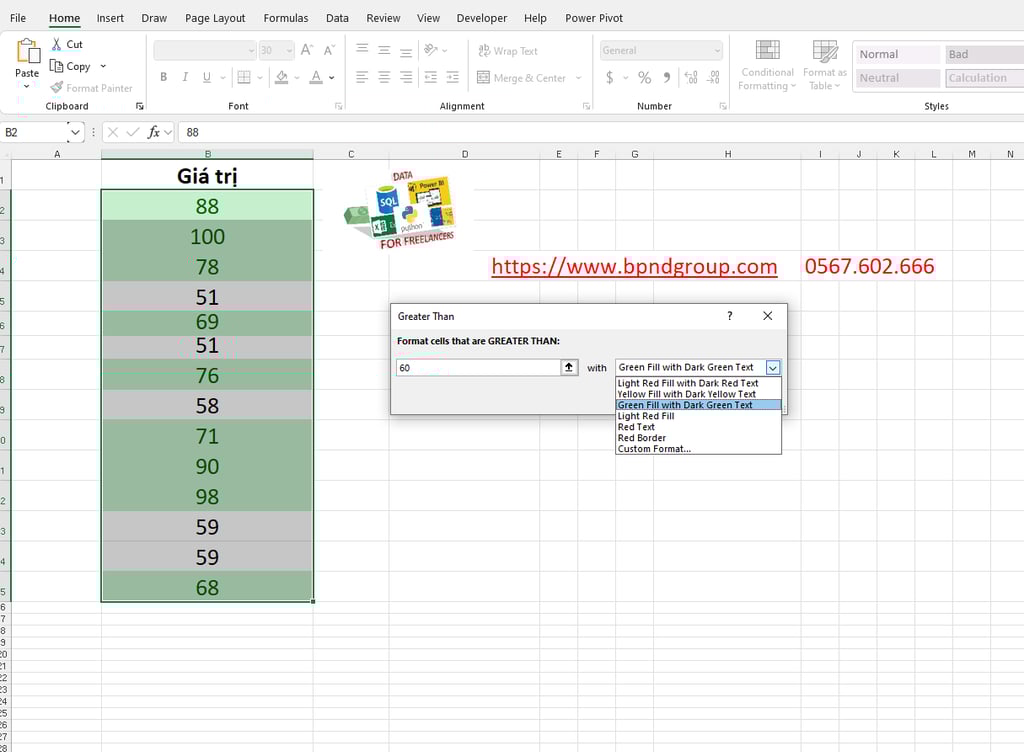 Bây giờ, trong loại giá trị “60” và chọn “Tô màu xanh lá cây với văn bản màu xanh lá cây đậm”:
