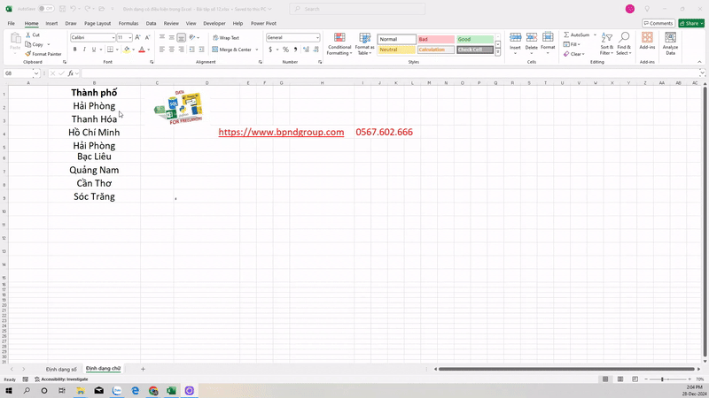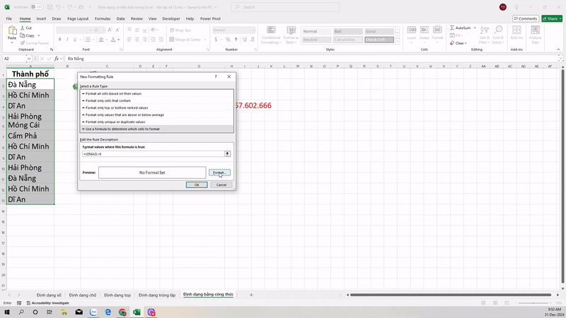 Bây giờ, chúng ta hãy xem cách chúng ta có thể định dạng chỉ những thành phố có chứa văn bản “Hải Phòng”: