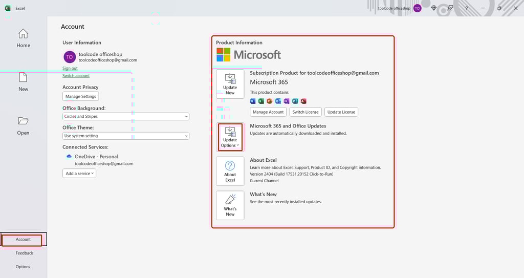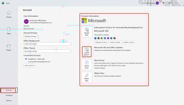 Để biết thông tin tài khoản , phiên bản microsolf hiện tại máy bạn đang sử dụng hãy chọn Account. Trong màn hình này thì mình đang sử dụng Microsolf 365. Nếu bạn muốn update thông tin hoặc các tính năng mới nhất của phiên bản office bạn đang sử dụng hãy chọn Update Options và chọn Update Now.