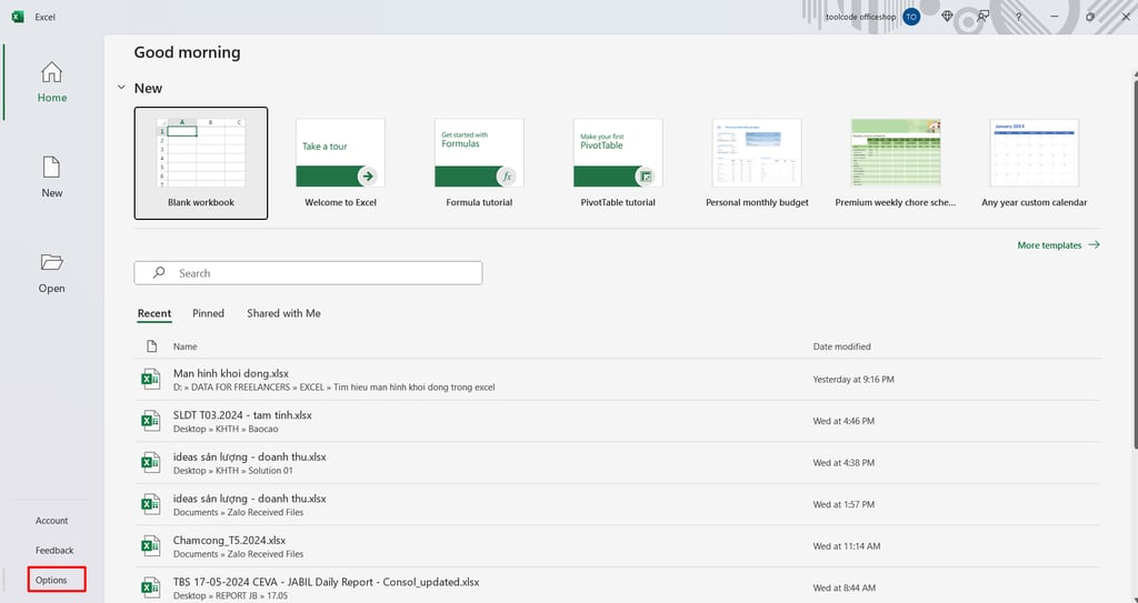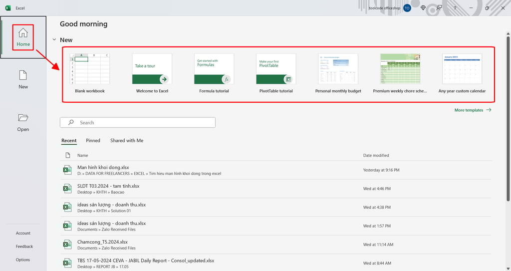 Giới thiệu một số tính năng trên màn hình khởi động excel