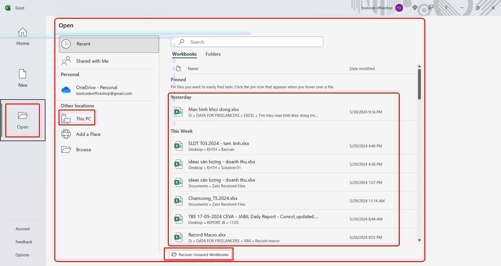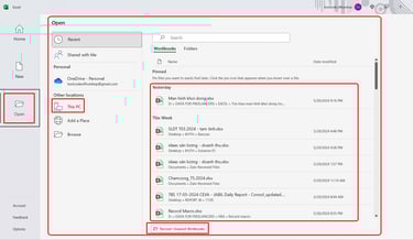 Khi bạn đã biết đường dẫn trỏ tới file excel mình muốn mở , hãy chọn This PC. Còn nếu bạn muốn mở các file gần nhất thì trong phần này cũng sẽ hiển thị các file làm gần nhất. Cuối cùng là chức năng cũng rất hay trong màn hình Open, đó là chức năng Recover Unsaved Workbooks. Nó có chức năng phục hồi các file bạn làm rồi mà quên lưu lại.