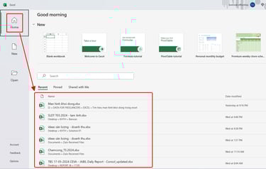 Phần 2 là các file excel gần nhất. Trong phần này, sẽ hiển thị những file excel mà bạn đã làm trước đó, thứ tự hiển thị là thời gian gần nhất sẽ hiển thị từ trên xuống dưới. Trong trường hợp, bạn không nhớ file excel mình mới làm lưu ở đâu. Bạn có thể vào phần này tìm kiếm cho nhanh nhé.