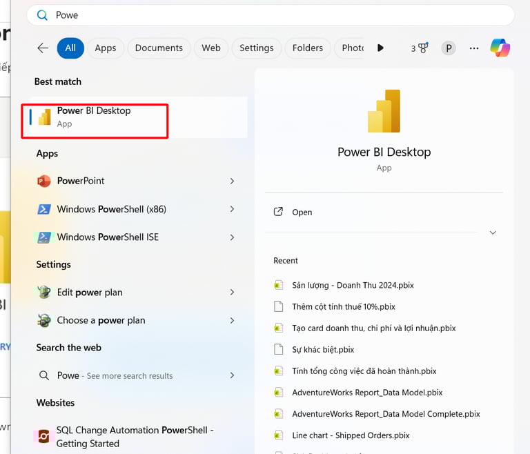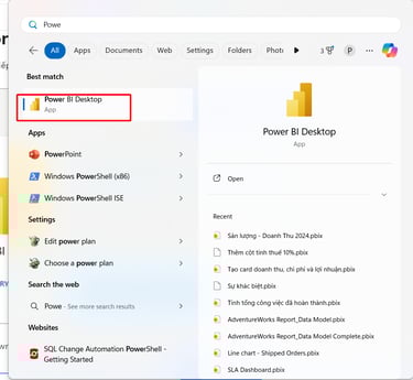 Tại phần Search bên ngoài Desktop bạn gõ Power BI. Nếu có biểu tượng Power BI Desktop hiển thị như hình bên dưới là bạn đã download và cài đặt thành công rồi nhé.