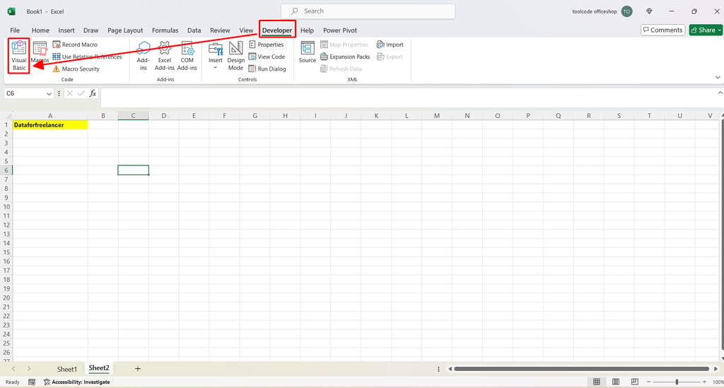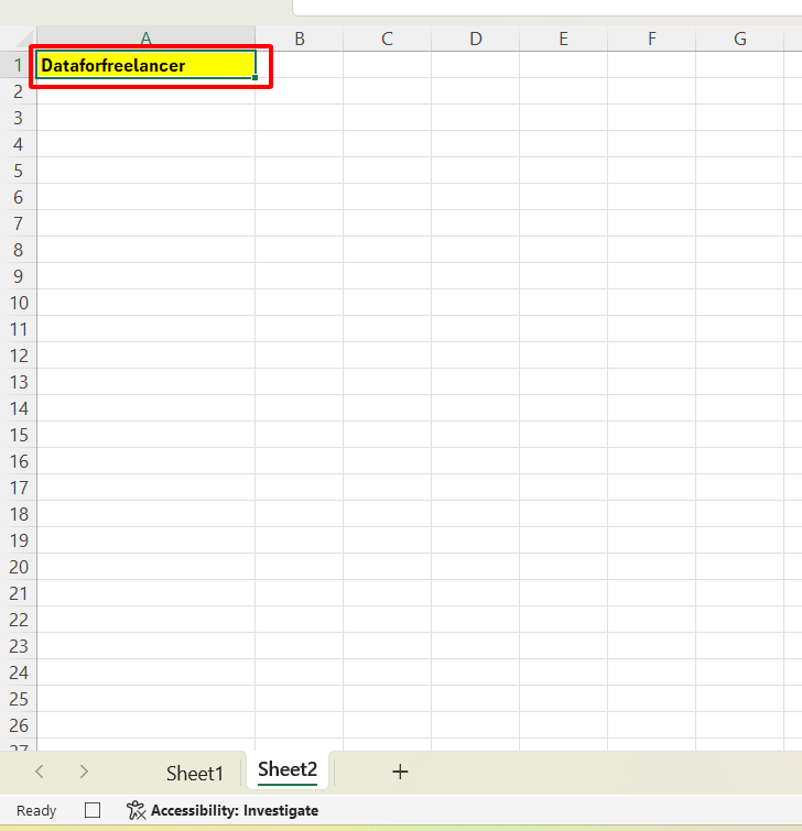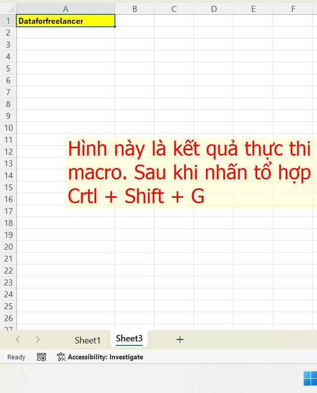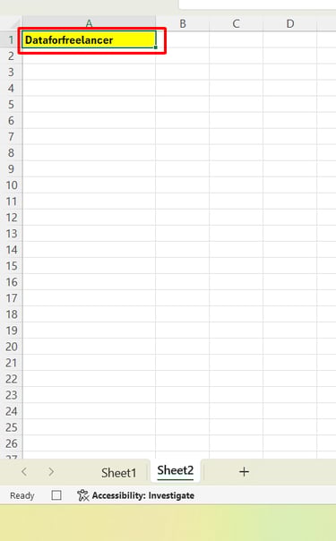 Tiếp theo, mình gõ chữ Dataforfreelancer vào ô A1 và format highlight màu vàng , tô đậm cho chữ này.