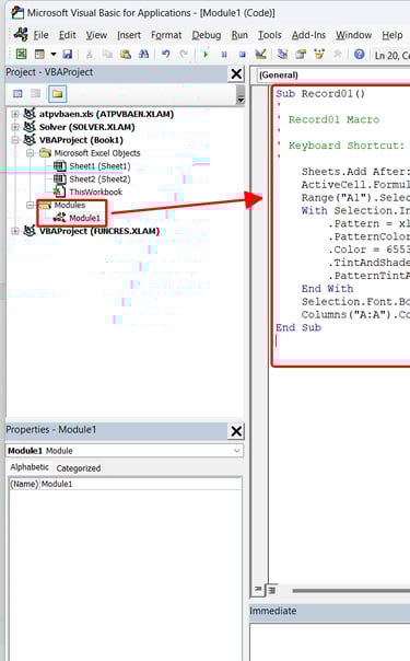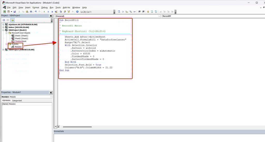 Vậy là bạn đã có được code record macro như hình trên với Sub tên là Record01