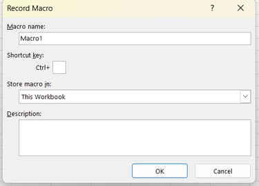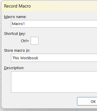 Shortcut key: Là phần bạn đặt phím tắt theo ý bạn . Để khi record xong , bạn muốn chạy macro này thì bạn chỉ cần nhấn tổ hợp phím tắt vừa đặt và không cần phải vào phần code để nhấn F5 chạy code.