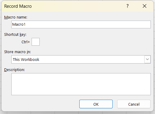 Trong trường hợp này là mình muốn record trên file excel này luôn. Nên mình chọn This Workbook