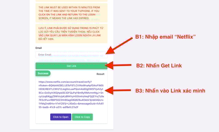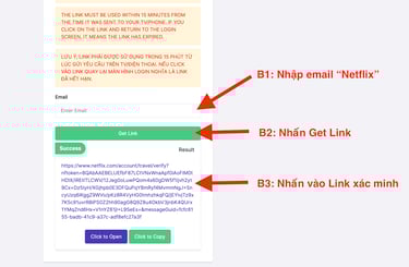 Sau đó: Điền email Netflix -> Get Link -> Nhấn vào Link dưới để xác minh là được, ảnh minh hoạ bên dưới.